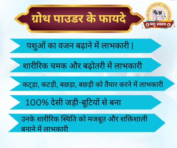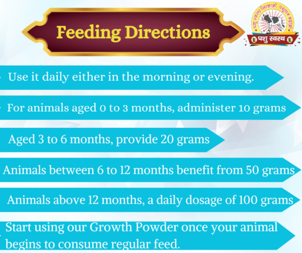 Dosage method: 0 to 3 months 10 Grams, 3 to 6 months 20 Grams, 6 to 12 months 50 Grams, above 12 months dosage of 100 grams continuously in the morning or evening after mixing in jaggery or ANIMAL FEED.