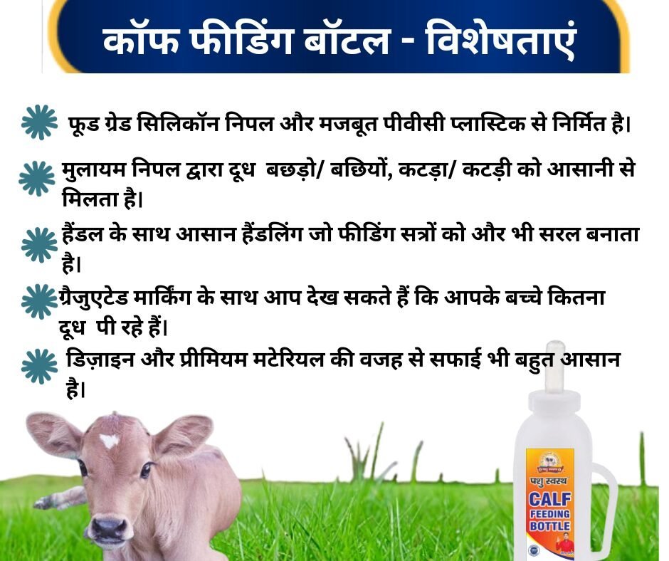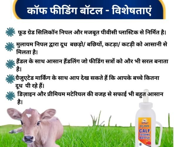 PASHU SVASTH Calf Feeding Bottle is a high-quality 2-liter bottle designed to make feeding calves easy and efficient. Equipped with a food-grade silicone nipple with multiple holes for smooth milk flow, this bottle features a durable PVC body and a graduated design to help monitor feed quantity. Perfect for dairy farms and livestock keepers, it ensures safe, hygienic, and comfortable feeding for young calves.