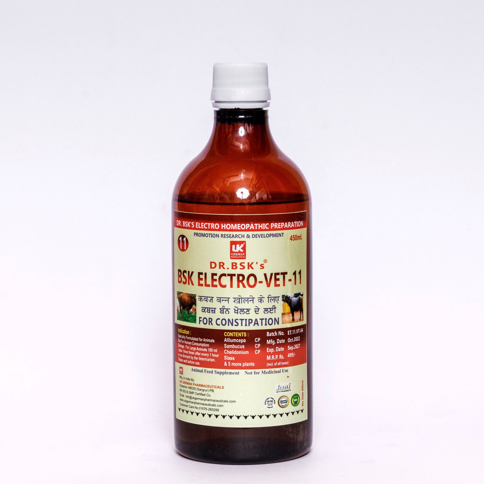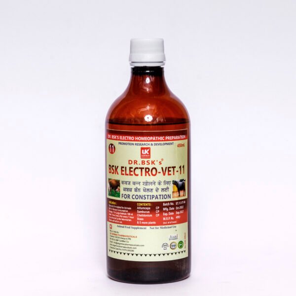 BSK ELECTRO VET-11 is an effective electrohomeopathy feed supplement specially formulated for veterinary animals suffering from constipation, hard stool, and irregular bowel movements. it helps in restoring normal digestive functions and promoting healthy bowel movements in cattle, buffaloes, horses, and other livestock. BSK ELECTRO VET-11 is highly recommended for veterinary animals facing constipation, reduced digestive efficiency, hard stools, or loss of appetite. regular use ensures smooth digestion, better feed conversion, and improved animal health.