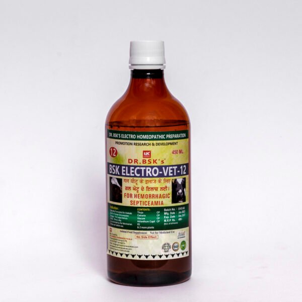 BSK ELECTRO VET-12 is a specially formulated electro homeopathy feed supplement designed to help prevent and manage hemorrhagic septicemia (HS) in veterinary animals such as cattle, buffaloes, and other livestock. HS is a serious bacterial disease caused by pasteurella multocida, leading to fever, swelling,   respiratory distress, and even sudden  death if untreated. highly  recommended  during  outbreak seasons of hemorrhagic septicemia,  especially in  monsoon or humid condition. regular  use helps in preventive care and supports faster recovery inn affected  animals, ensuring better health  and productivity.