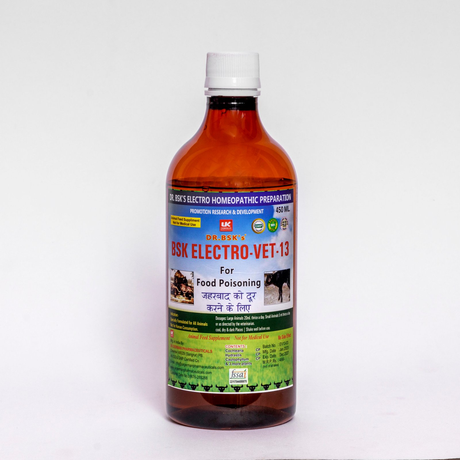 BSK ELECTRO VET- 13 is a powerful electro homeopathy feed supplement specially designed for veterinary animals suffering from food poisoning caused by spoiled feed, contaminated water, or toxic substances.. it helps detoxify the animal’s body and restores normal digestive health.