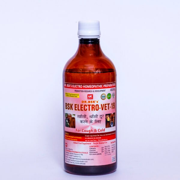 BSK ELECTRO VET-19 is an effective electro-homeo-pathy feed supplement specially formulated to manage and treat cough, cold, respiratory infection, nasal discharge, and throat irritation in veterinary animals. iot helps to relieve respiratory distress and improves lung health naturally.